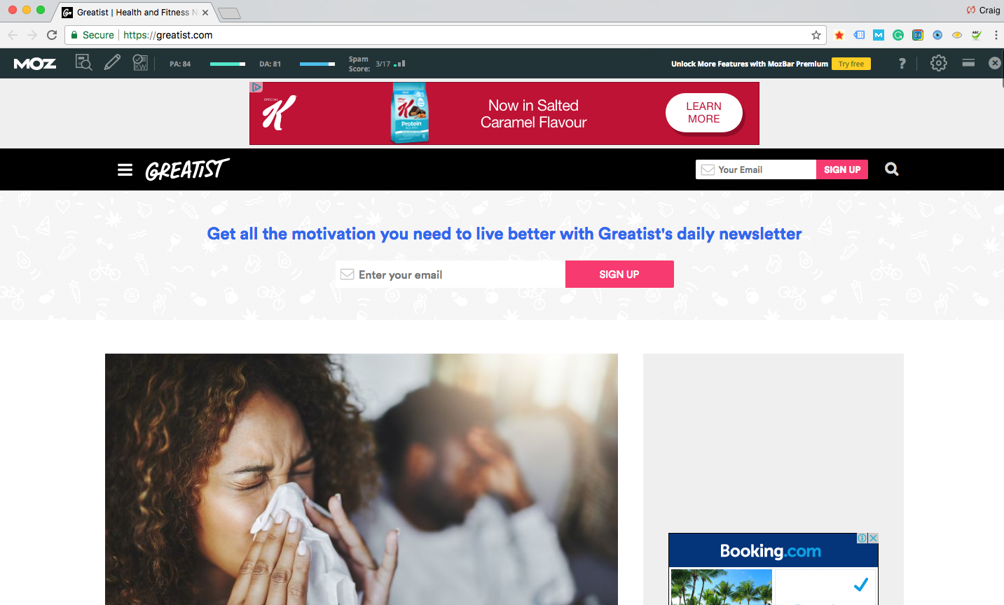 We came across a large blog called Greatist. You’ll notice on MozBar shown above the domain authority is 81, that is extremely high for a health blog. For this reason, when we found Greatist we automatically judged it as a high profile blogger.
