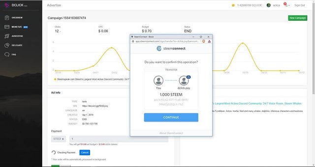 Dclick.io ad campaign made for SteemSpeak.com discord using 1 steem