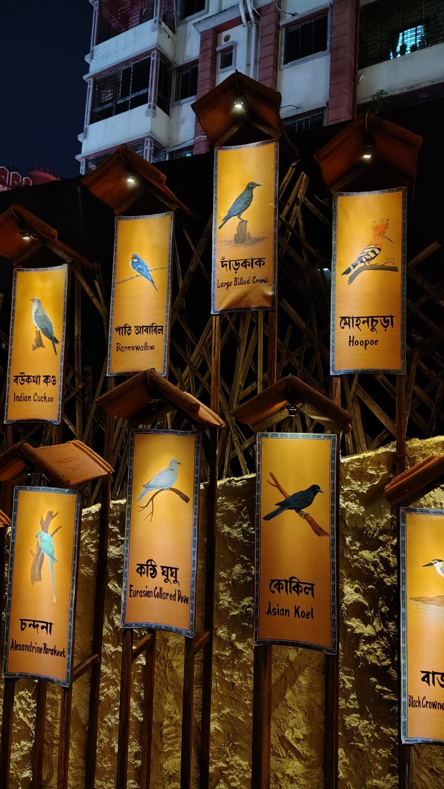 পুরো পুজো মণ্ডপে একটা দারুন চিন্তাভাবনা নিয়ে করা হয়েছে এককালে বাজারে বা মাঠে সহজেই ধরা যেত কিছু পাখি এখন তারা কেবল ইতিহাসের শুকনো নথি কিংবা প্রাচীন চামড়ার সংগ্রহের টিকে আছে।যেমন গোলাপী শির হাঁস, সারস পাখি, মণিপুর বুশ কোয়েল, লালমাথা শকুন, দাড়িওয়ালা লামারগাইর , তিস্তার সাদা-মাথা বাবলার সবাই মিলেই বাংলার হারানো আকাশের প্রতীক। তাদের ডাক আজ শোনা যায় না কিন্তু স্মৃতির আকাশে তারা এখনো ভেসে থাকে যেন বিবর্তনের দীর্ঘ যাত্রার এক নীরব সাক্ষী।