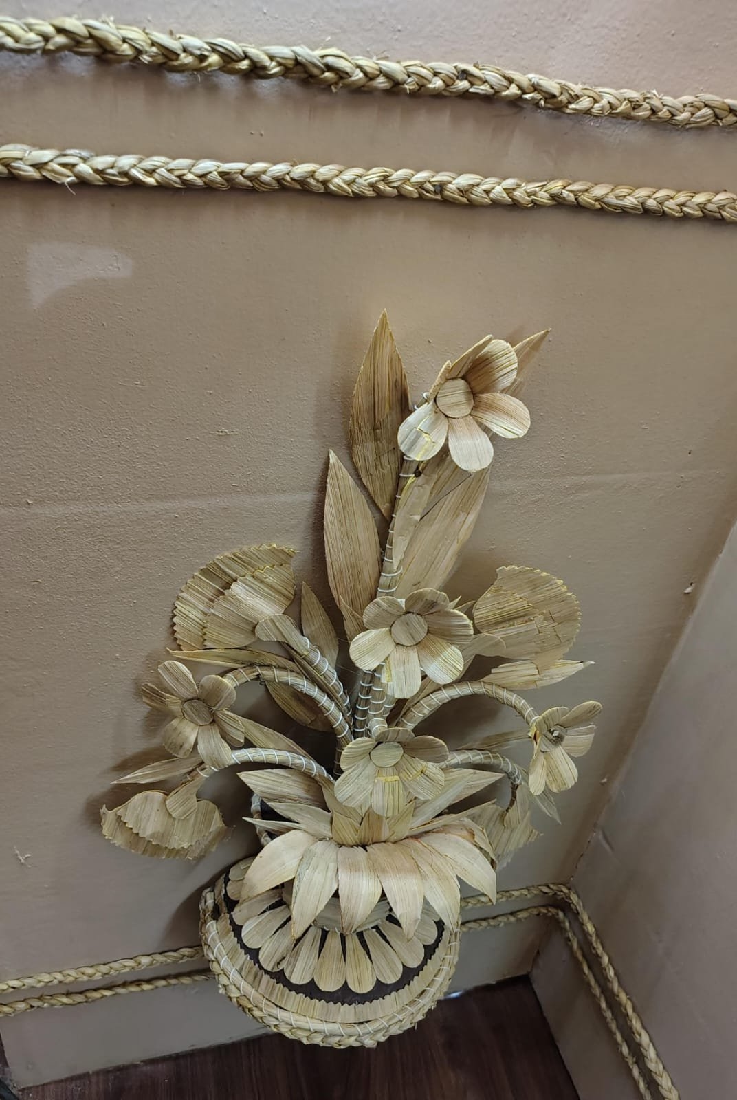 মণ্ডপে প্রবেশ করলেই দেখা যাচ্ছে খড় এবং ধানের শীষ মিলেমিশে একাকার। যেখানেই তাকানো যায় সেখানেই মনে হচ্ছে ময়ূর ঘুরে বেড়াচ্ছে। এই গোটা পূজা মন্ডপ ধান, যব, খড়, শস্য বিভিন্ন প্রাকৃতিক জিনিসপত্র দিয়ে তৈরী। পুজোর মণ্ডপে কোনায় কোনায় যা যা জিনিস আছে ধান,পাট,শস্য এগুলো প্রকৃতি থেকেই এসেছে আর মা-ই এগুলো দিয়েছে আর সেই জিনিস দিয়েই প্যান্ডেল সাজানো হয়েছে। এক কথায় প্রকৃতির জিনিস দিয়েই মাকে সাজানো হয়েছে।যেখানে চারিদিকে নানা রকম কেমিক্যাল মেটালস রয়েছে সেখানে জৈব উপাদান দিয়ে নন টক্সিক বা ইকো ফ্রেন্ডলি সেই ভাবেই তৈরি করা হয়েছে। মা চান পৃথিবীতে রক্ষা করতে। তাই সেই সকল জিনিস দিয়েই পুরো মণ্ডপটা তৈরি করা হয়েছে।এখানে সবথেকে বড় আকর্ষণ নবদুর্গা। একদম সাবেকিআনায় প্রতিমা তৈরি করা হয়েছে।