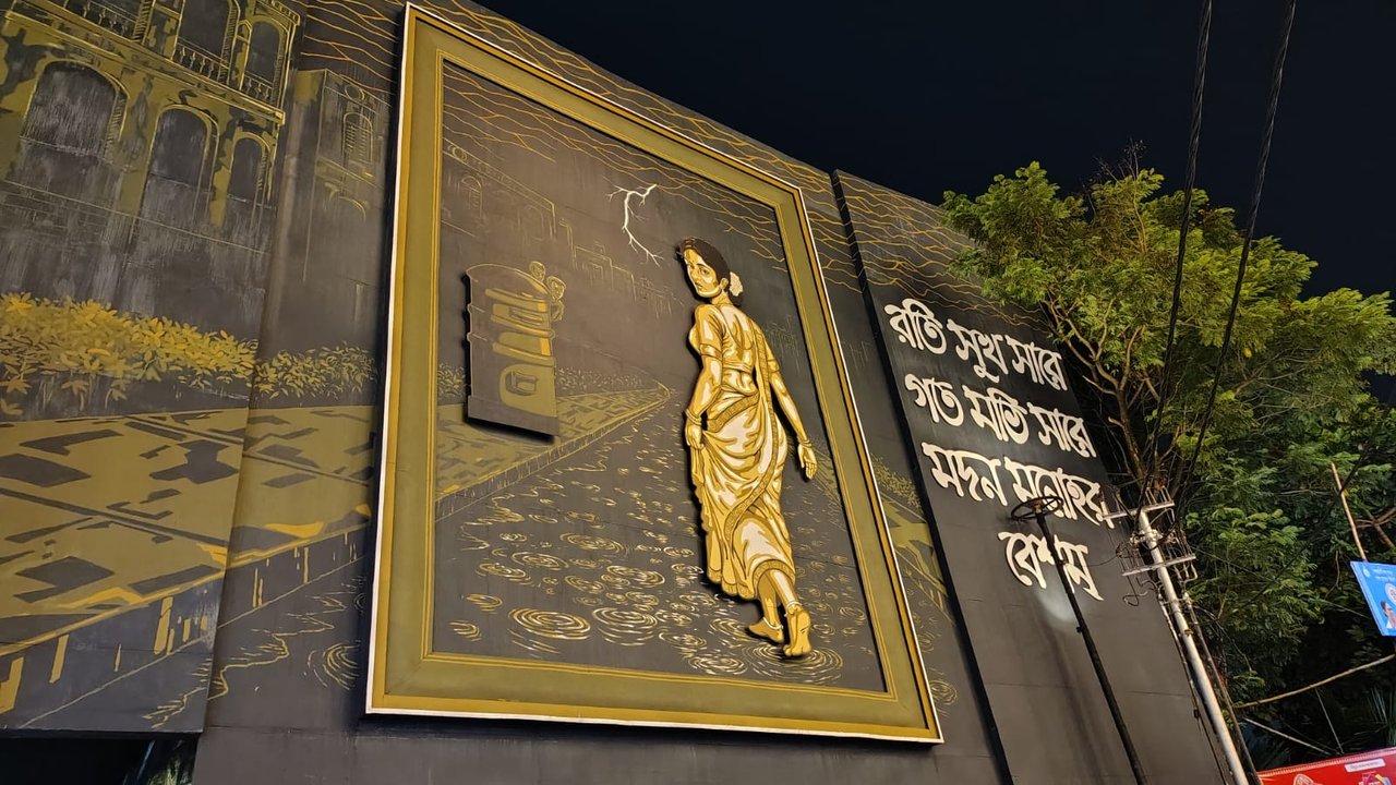 ★★প্রথমে আমরা রেলপুকুর গিয়েছিলাম। এখানে পূজা মন্ডপটি শব্দ এর উপর নির্ভর করে পুরো মন্ডপটা তৈরি হয়েছে। "পাখি সব করে রব, রাতি পোহাইলো, মদনমোহন তর্কালঙ্কার এর সেই চিরচেনা পংতি আমাদের ভোরের আদি সংগীতের কথা মনে করিয়ে দেয়। এক সময় পাখিদের কলতানেই ভাঙতো রাতের নিস্তব্ধতা।তারা আমাদের আগে জেগে উঠে জানিয়ে দিত নতুন সূর্যের আগমন। আজও পাখি ডাকে তবে সেই ডাক আর আগের মত সমবেত নয়।সময়ের সঙ্গে সঙ্গে প্রকৃতির সেই অনন্ত শব্দধারা ক্রমশ ক্ষীণ হচ্ছে।কিছু কিছু সুর নিঃশেষে মুছে গেছে আর কিছু সুর হারিয়ে যাচ্ছে কালের অতল গভীরে।এর হ্রাসমান শব্দ, এই নিস্তব্ধতার মধ্যেই আমাদের স্মৃতিতে বেজে ওঠে অদৃশ্য ব্যথা★★।