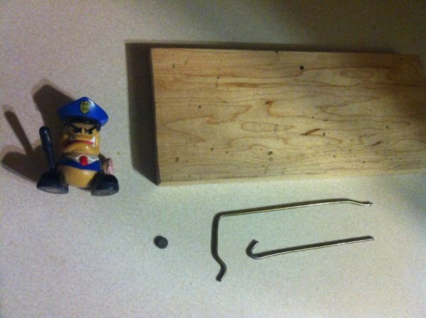 Sure. There is not much to it really. A board with a hole in it, two pieces of coat hanger, and a small but strong magnet like from the foot of this fingerboard toy.