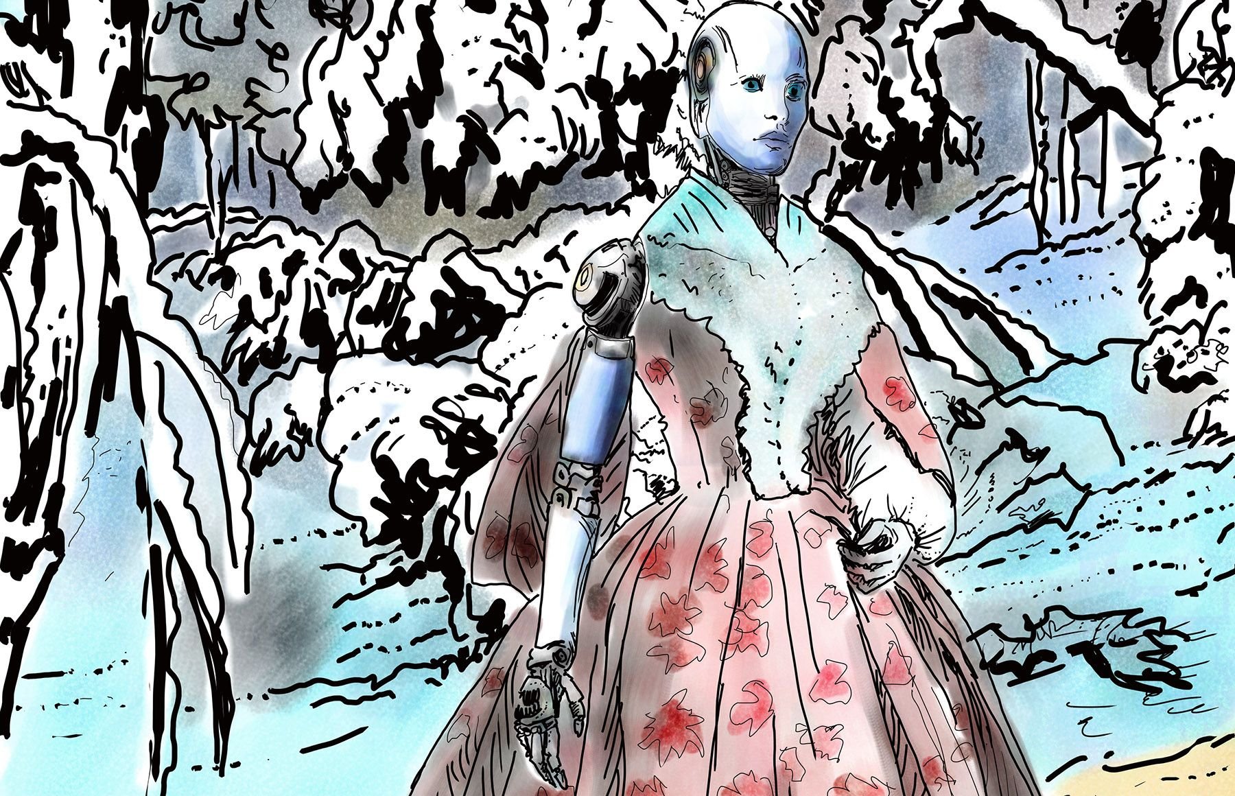 Rather than cold steel worlds of flying cars and post apocalyptic scenes I keep picturing the composite human/android clearly searching for a moment of beauty and delicacy.
