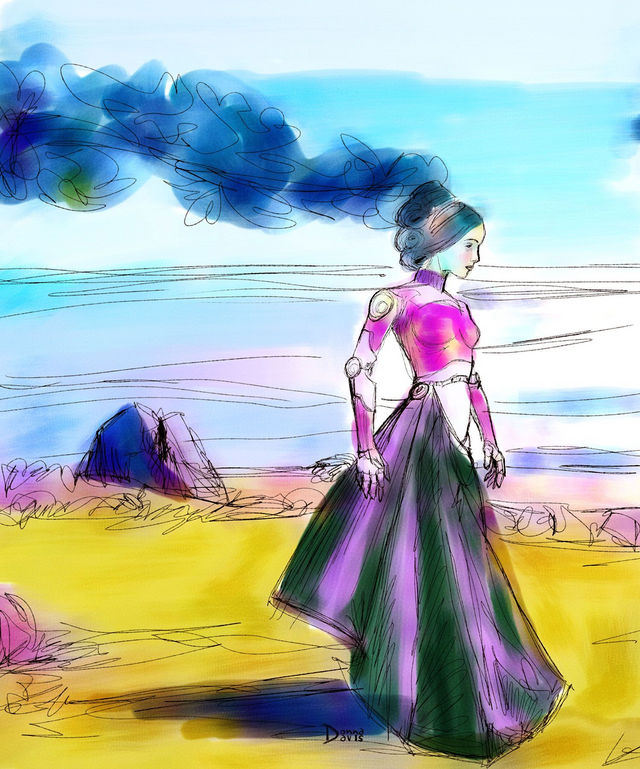 That time I sat and looked out onto our view and dreamt of the android machine girl out there free of worry of storms and power. It had a lighter feel. Here is that sketch: