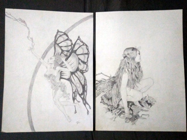 Actually... Let me see if I can find it... I found it! Safe and sound in my trusty, dusty, old folder. I took a photo of it, and four others. The two fairies at the bottom were copied from a book. (How I wish I could draw like that straight from my mind!).