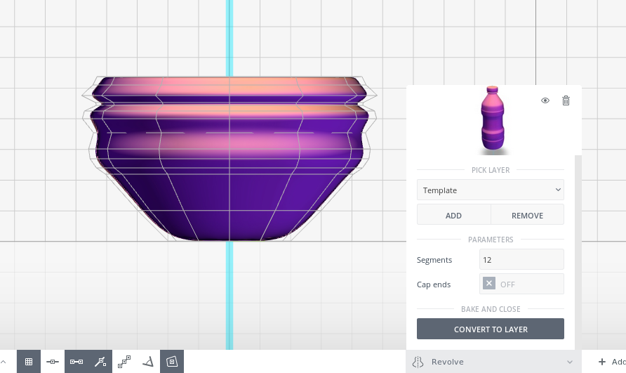 The most complex (and annoying) part of Vectary's Revolve plugin is that you can't redefine which axis you want to rotate around (bluish highlight is said Axis).
