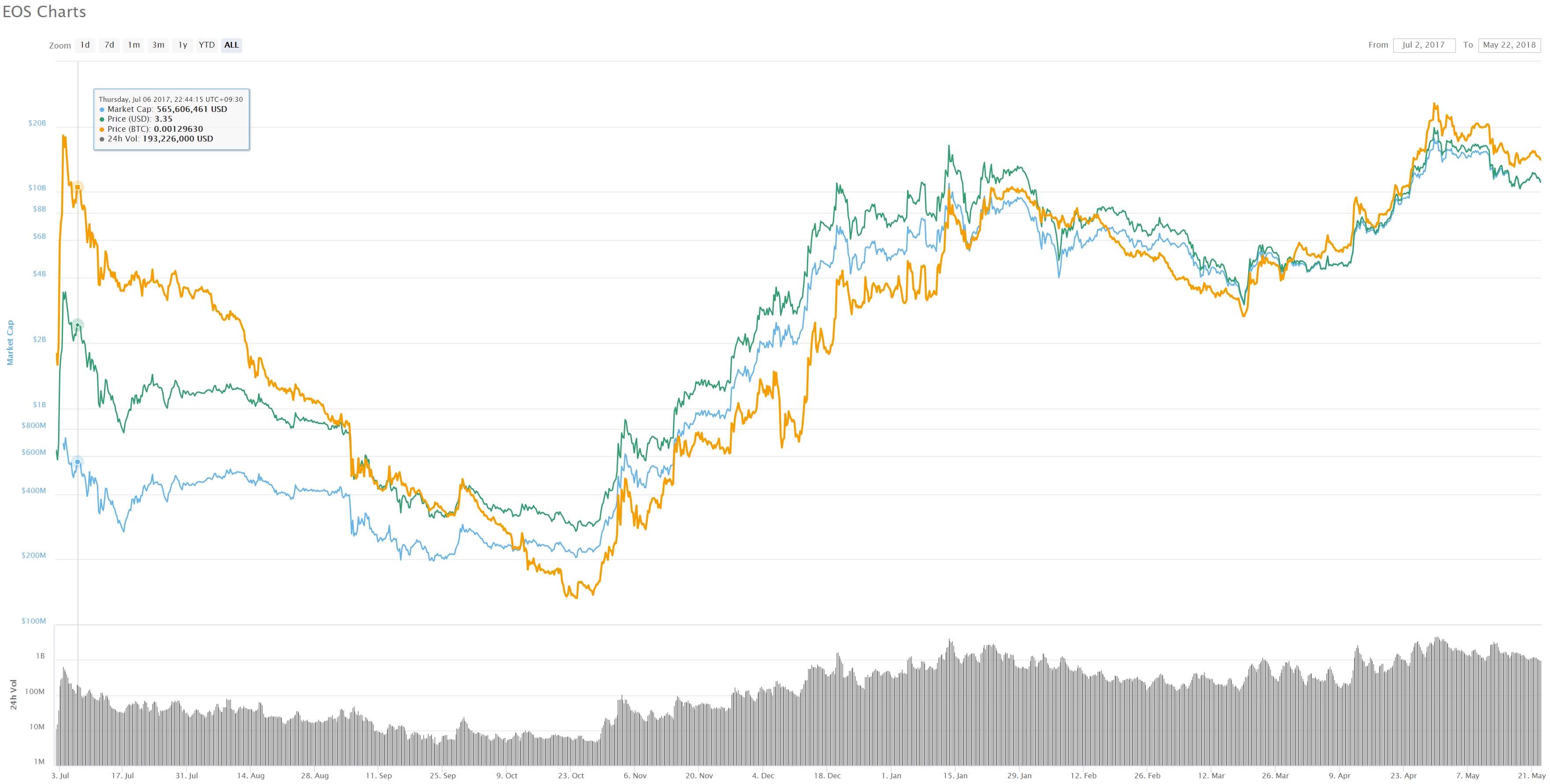 Screenshot from Coin-Market Cap, showing the trajectory of EOS since day 1 of the crowdsale until now.