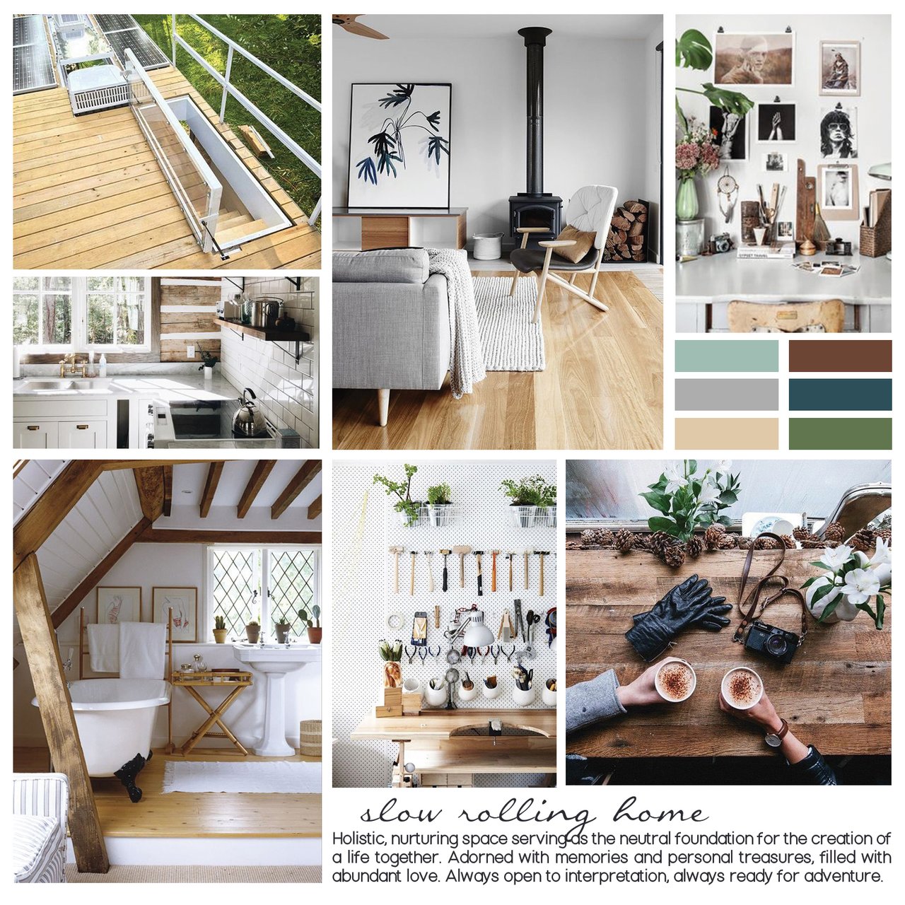 Below is the collection of visual inspiration we've used to design the broader elements, like color scheme and wood selection, and more specific pieces like cabinetry, shelving, and that cool circular wood storage holder.