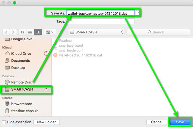 I highly recommend you connect a USB memory stick to your computer to save the file. You see my example under devices, I renamed my USB stick to SMARTCASH.