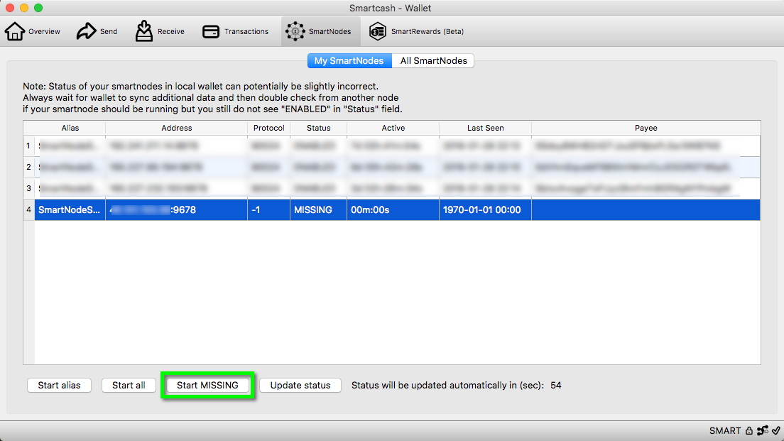 Click on "Start MISSING" button. (Clicking on "Start all" will reset any other SmartNode already started and push their payment date back. Start MISSING only starts nodes that need to be started.)