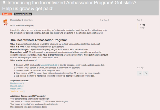 (Another example of SmartCash rewarding those who help build up the community. Source: https://forum.smartcash.cc/t/introducing-the-incentivized-ambassador-program-got-skills-help-us-grow-get-paid/155)