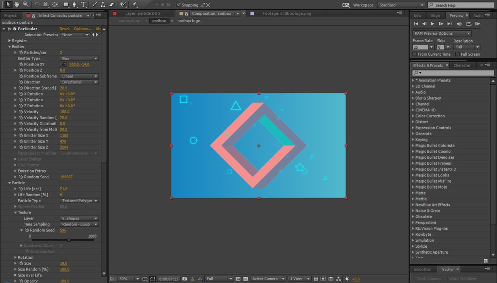 - Taking inspiration from the @sndbox graphic above I decided to incorporate a peppering of random shapes. To make the shapes change as they are gently falling I first creating a separate 8 second composition at 200x200px and added the 4 different shape layers.