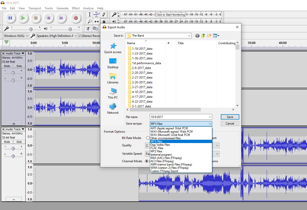 It's also great for recording via a built-in microphone or any external recording device. In fact, I use Audacity to record my band's practices each week so we can go back and listen to them. The audio from our band's videos on YouTube was all recorded via Audacity (and a bunch of other jury-rigged equipment but that's anothers story for another time). Need to record a podcast? Just plug up your microphone, select it as the recording source, and go. Then export the audio as .wav, .mp3, or any other format that you like.