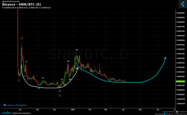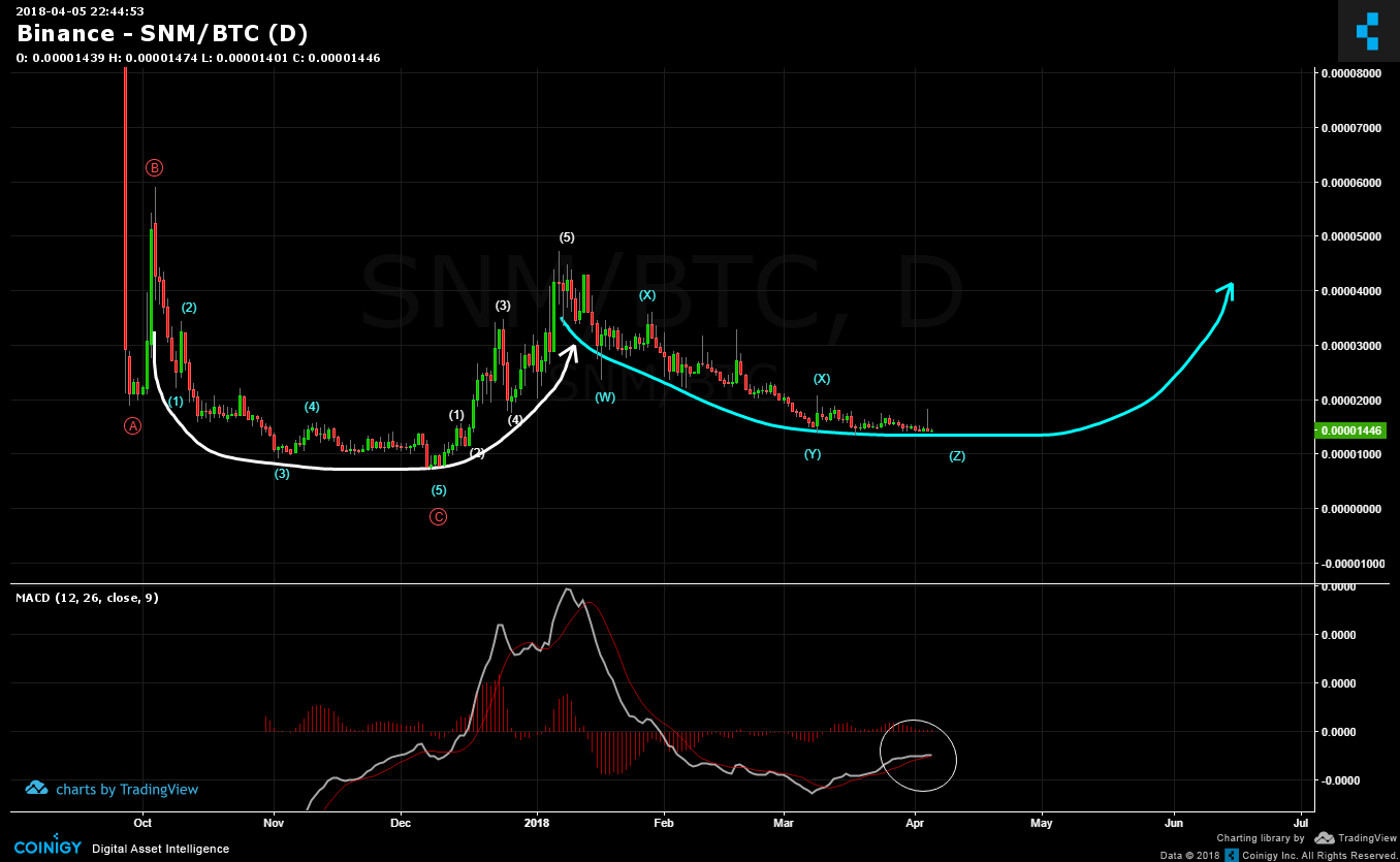 SONM (SNM/BTC) initially declined in an ABC correction as confirmed by the subwaves. Subsequently, a trend reversal was signaled by white impulse waves and the current correction in progress is likely to generate an incremental lower low but not an all time newer low.