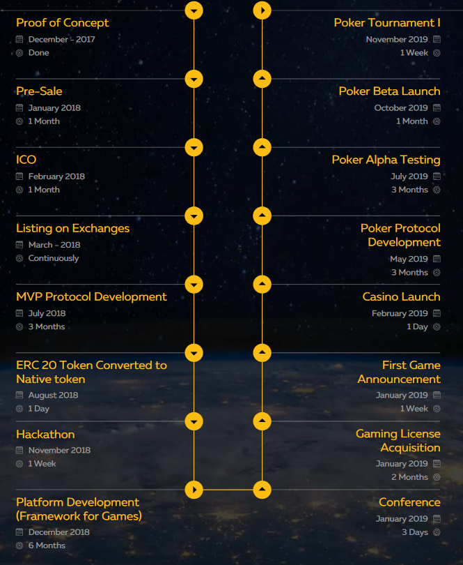 The crowdsale is divided into a presale and four sales phases. The price per token after each phase increases to stimulate early investment. In addition, early investing gives you a better chance of earning a Jackpot later because there is a chance of getting chips with a higher factor. Also early investing allows for possible participation in the four rounds of Jackpot that contain smaller jackpots called Lots. The possibility of earning a share of the jackpot depends on the amount contributed by the investor to crowdsale.