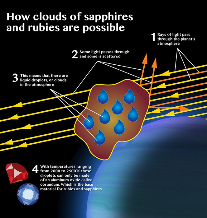 This indicates that the outer planet contains the clouds, with liquid drops at a temperature of 2226 ° C. In this case, the planet's cover appears to contain the metal corunde compound, which is embedded in the sapphire stone on the ground, leading to the conclusion that WASP-12b contains rubies of sapphire
