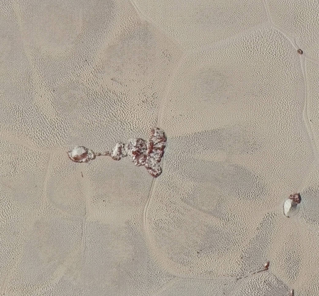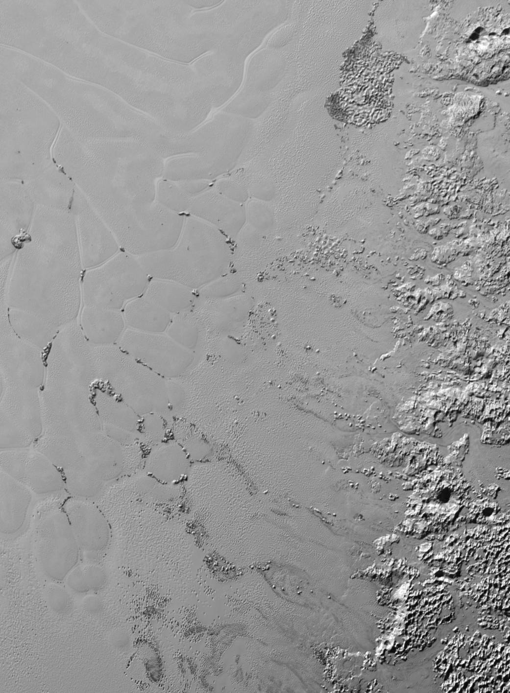 Here, islands of icy mountains stick up out of the nitrogen ice plain. Notice how the plain is subdivided into "cells" - these are believed to be geologically active.