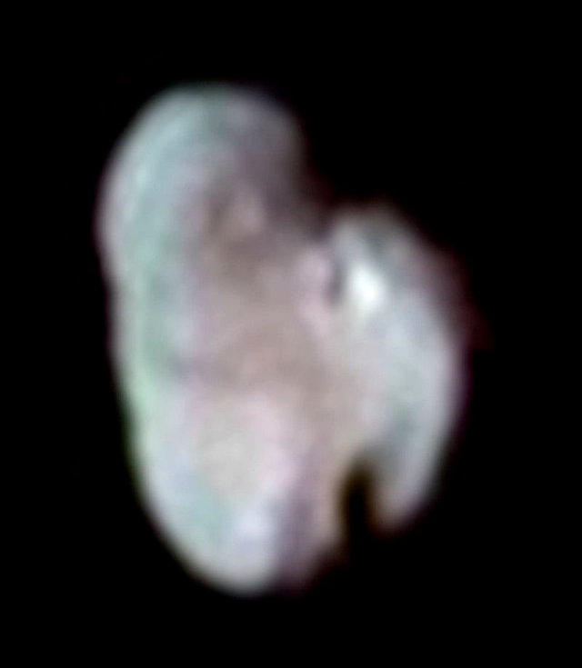 Kerberos is the bigger of the two and takes the form of a lumpy peanut. Approximately 20 kilometers by 10 kilometers in size, very little is known about it. It's composition is similar to the other small moons of Pluto.