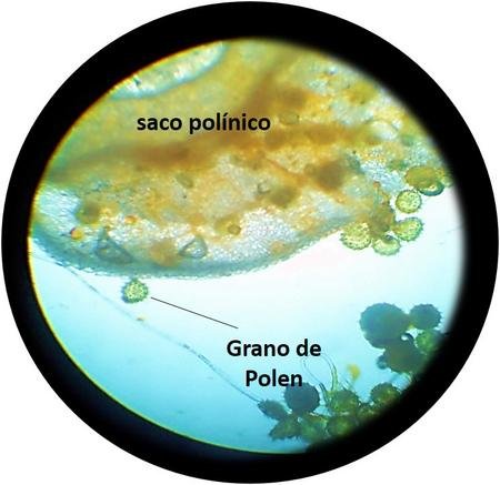 Seguidamente observaremos el grano de polen, célula germinal masculina, visto bajo el microscopio óptico desde un aumento de 100x. Observa, los sacos polínicos antes descritos y el grano de polen en su interior.