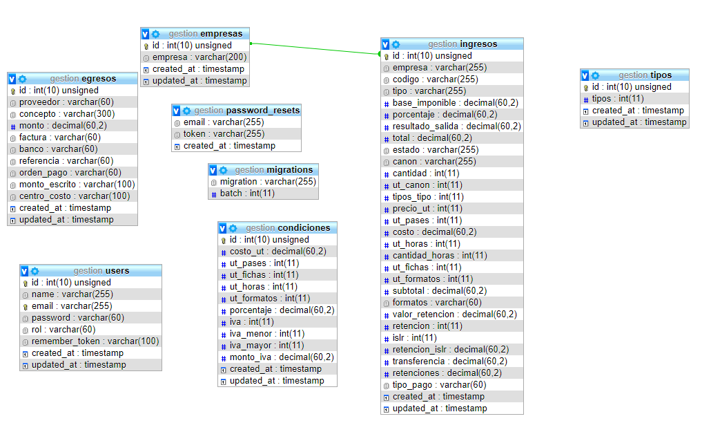 Como todo gran sistema de información se necesita una base de datos donde se pueda almacenar la información y hacer posterior uso de ella. Phpmyadmin es una herramienta que permite el manejo del sistema gestor de base de datos MySQL.Haciendo uso de MySQL se creo la base de datos del sistema y a pesar de que también se pueden crear las tablas del sistema decidí hacer uso de la opción de Laravel conocida como "migraciones".