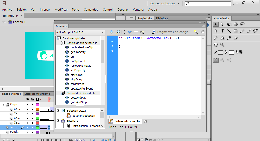 Empezamos a configurar los botones, primero en de la introducción. Damos click sobre nuestro símbolo y abrimos el panel de acciones, en flash podemos encontrar un listado de codigos que facilitaran aun más esto, sigue los pasos de las imagenes