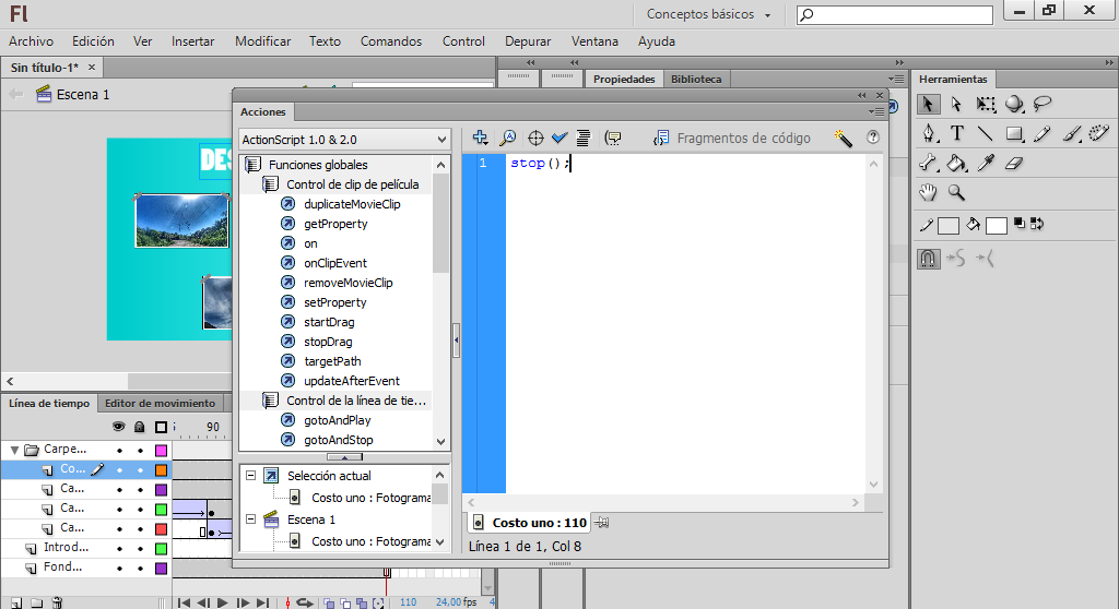 Paso 4: Nos posicionamos en el ultimo fotograma, abrimos el panel de acciones y agregamos el comando: "stop();", esto para que no se repita constantemente la animación sino que se pause cuando culmine la aparición del primer botón. Esto lo aplicamos al final de cada animación de nuestro menú.
