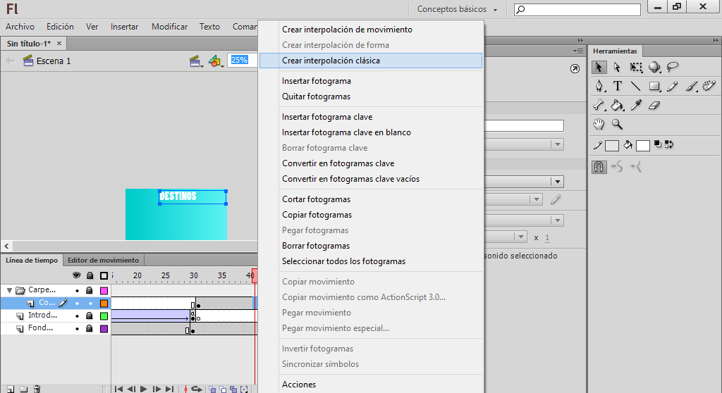 Agregamos algunos fotogramas para que se realice la animación pero no movemos nada el botón, luego damos click derecho en medio de esos fotogramas y damos en "crear interpolación clasica". Luego de creada la interpolación vamos al fotograma uno y escogemos la opción de alfa en 0, ¿qué ocurrira?: nuestro boton pasara de tener el alfa en 0 a tenerlo en 100, es decir, pasara de invisible a visible (Jajajajaja, soy la máximo explicando, ¿o no?)