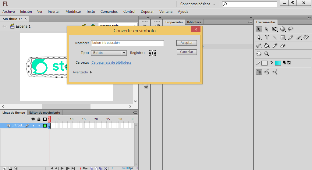 Paso 2: Empezamos con el uso de botones, en mi caso, utilice el logo de steemit y hice un botón usando la herramienta rectangulo que trae por defecto flash. Esto se puede hacer con otro software como photoshop, ilustrator, etc... Una vez hecho nuestro boton, lo seleccionamos y presionamos la tecla "F8", tendremos tres opciones: Convertir en un clip de película, un gráfico o un botón; escogemos la opción de botón y le asignamos un nombre para así llevar un ordén, en mi caso es "boton introducción"