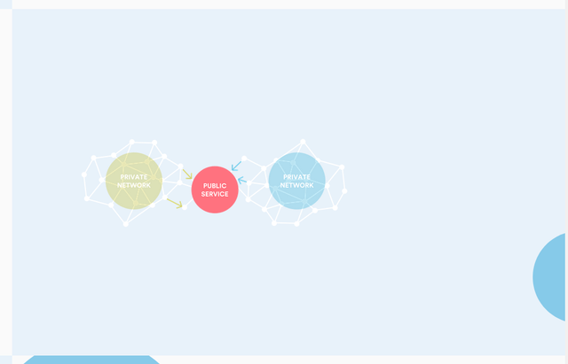 Una empresa privada que requiera un servicio y una cotización puede enviarlo a la red pública para que los diferentes participantes envien sus propuestas. Todo dentro del blockchain, interactuando los servicios y aplicaciones de redes privadas y públicas.