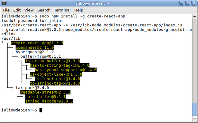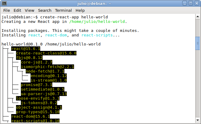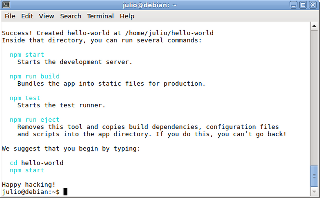 Luego de unos segundos un mensaje aparecerá diciendo que nuestra aplicación fue creada exitosamente y nos dará algunas instrucciones básicas. Luego de que haya terminado de configurar la aplicación, nos movemos al directorio que se acaba de crear y que tendrá por nombre el mismo nombre de nuestra aplicación. Mi aplicación se llama hello-world