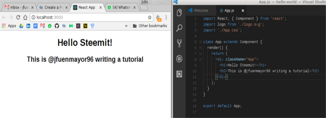 . Una característica bastante útil es que todos los cambios que hagas dentro de tu aplicación mientras el servidor local este corriendo serán mostradas automáticamente en el navegador sin la necesidad de apretar el botón de Refrescar página/F5. Ahora, vamos a modificar un poco esta aplicación, yo voy a abrir el directorio en donde se encuentra la aplicación con el editor Visual Studio Code, ustedes pueden utilizar el de su preferencia.