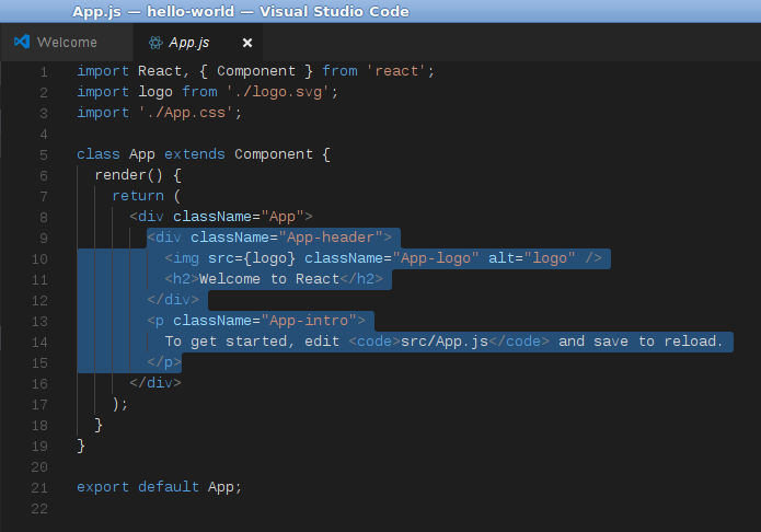 y vamos a editarlo un poco. Borramos la parte de código que está seleccionada y vamos a cambiarla. Ten en cuenta que tu componente debe devolver un único elemento, generalmente se suele devolver un div