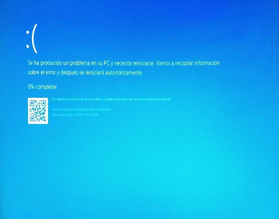 Lo primero que debes hacer es anotar el stop code, en este caso aunque no se ve en la imagen es KERNEL_SECURITY_CHECK_FAILURE En Windows 10 aparece un código QR, no intentes escanearlo porque solamente enlaza a una página genérica de ayuda de Microsoft. También es importante anotar la hora exacta del cuelgue y los últimos cambios que realizaste antes del mismo. A veces el ordenador reinicia automáticamente, a veces se queda colgado. Si el procentaje de progreso no Avanza y la luz del disco duro no parpadea, probablemente se quede colgado y deberás apagarlo manteniendo pulsado el botón de encendido. Si aún así no responde, desenchufa el ordenador o retira la batería.