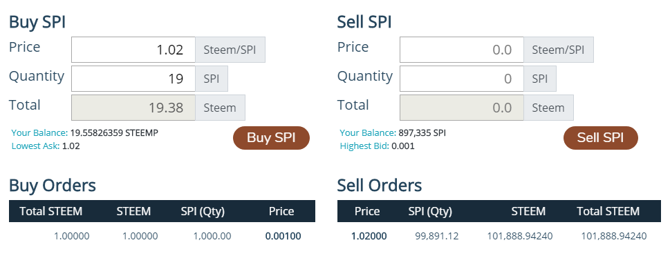 Go to the SPI market by searching SPI. From here, you will need to enter in 1.02 is the buying price. These are priced at 1.02 STEEM until 1 million are sold. Then the free market will take over. Once 1 million sells, you will never buy a SPI token for close to 1.02 STEEM ever again. You enter in the amount you would like and click on the buy SPI button and verify the transaction