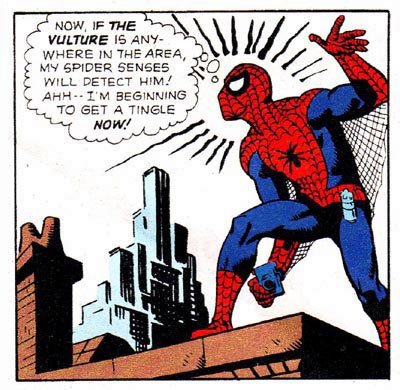 Spiderman cuenta con un sentido arácnido que le avisa de los peligros con un cosquilleo en la nuca. No sabe que peligro es pero si en que dirección moverse para evitarlo. Así Spiderman no tiene que preocuparse de mirar por donde anda ya que su sentido arácnido le avisara siempre que este en algún tipo de peligro(golpes, caidas, )