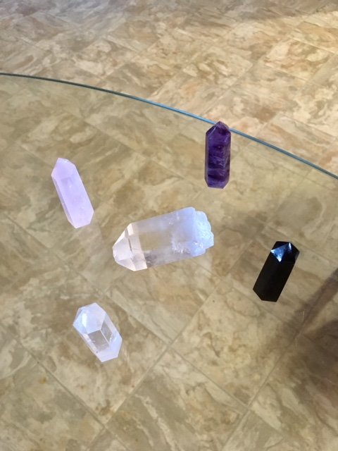 (Above are the crystal wands which include clear quartz, black obsidian, amethyst, rose quartz - surrounding the Lemurian seed crystal)