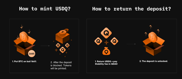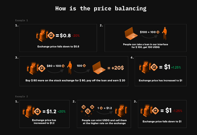 An illustration on how USDQ and other stable coins work. Along with the QDAO tokens: