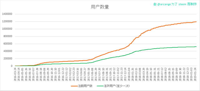 在这份图表里,橙色的线显示了注册帐号的总数。绿色显示了至少活跃一次的用户数(活跃指得是用户至少发表一篇帖子、评论一次或者点赞一次)。这些用户即使在后面不再使用帐号也会被统计进去。
