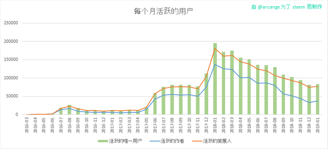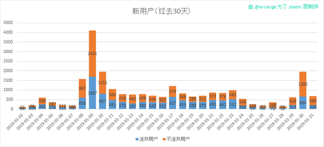 这些数据表显示了最近30天内用户随着时间的活动情况。这里的活跃和上面的定义是一致的。最后面的这张数据图显示了每月的活跃用户数。这可以让我们和 Steem 上的数据甚至是其它社交网络上的数据做比较。