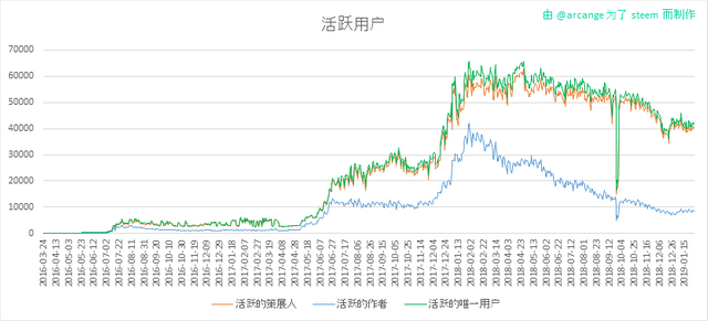 这份图表显示了在 Steem 新注册的用户并且有多少用户是活跃的。我们可以看到有很多的帐号被创建了,但是从来没有被使用过。