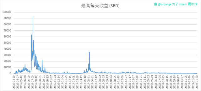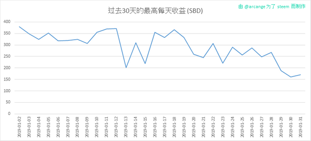 这个图表显示了每一天(整个区块链和过去30天)内在一篇帖子(或者评论)上的最大奖励(收益)