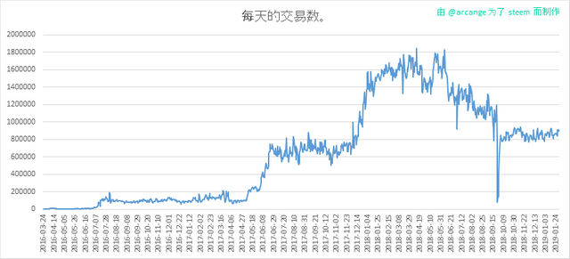 这个图表显示了每天的交易数。我们可以了解到整个区块链上的活动。