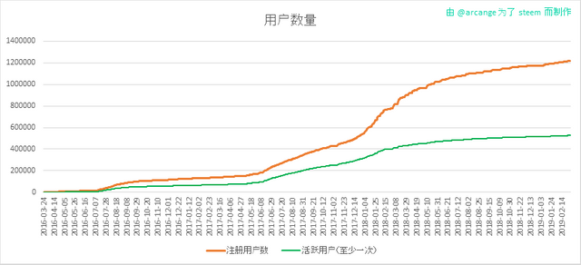 这份图表显示了在 Steem 新注册的用户并且有多少用户是活跃的。我们可以看到有很多的帐号被创建了,但是从来没有被使用过。