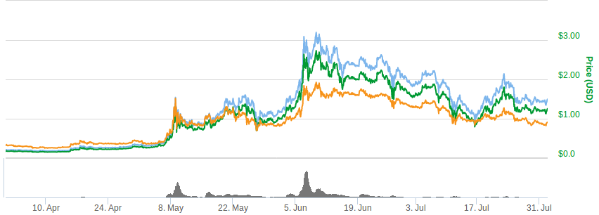 After several peaks in the beginning of June, the market is relaxing and goes slightly down. Last month all attention was attracted to Bitcoin Hard Fork. Investors probably transfered assets to BTC in desire to get Bitcoin Cash (BCH) from the Fork for free. Let's see how it influenced to STEEM market.