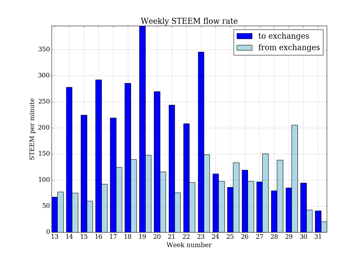 STEEM is massively streaming to exchanges till the week 24 (June, 12), then it mostly streams in another direction from exchanges and I would say the activity almost stop at the end of July. Steemians sold STEEM on spike with high price on exchanges and buy back cheaper lately. What is next step? Investors will sell BCH and vest to altcoins?