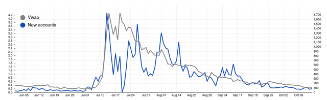 A basic metric of any startup, user acquisition provides insights into the future trends of Steem platform. Chart is based on number of new accounts grouped by the created date. Only accounts that have performed any of these actions are included: post, comment, vote.