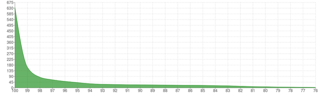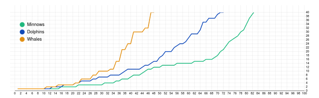 Number of votes made yesterday by minnows, dolphins and whales by percentiles. Data demonstrates that most Steem users do not deplete their voting power and therefore do not maximize their curation rewards. Note: Voting power depletes completely by voting 200 times during 5 days therefore daily votes metric has some degree of imprecision. If you are interested in increasing your curation rewards, get in touch with me on steemit.chat