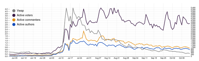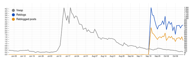 NEW: number of reblogs, number of reblogged posts, number of users who followed at least one account. Making invisible visible: daily payouts, active users, new users, top posts, top comments and others.