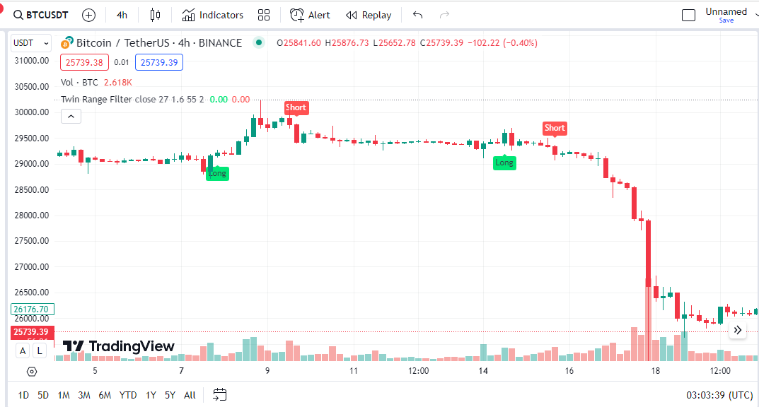 The Twin Range Filter indicator is an indicator that gives us a clear signal of when to long or short the market. The signal always comes after the first bullish or bearish candle. The stop loss is usually below the first bullish or bearish candle before the entry position.