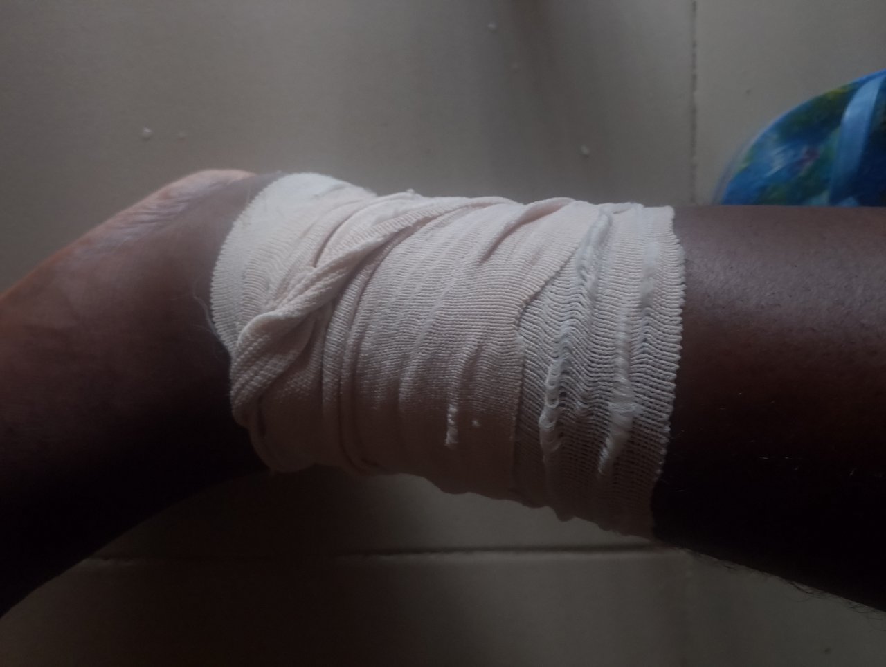 - Compression . This is done by using a bandage to tie up the affected area making sure the tying is not too tight to avoid blood accumulation. I carefully did this and allowed her to carry it for some hours.
